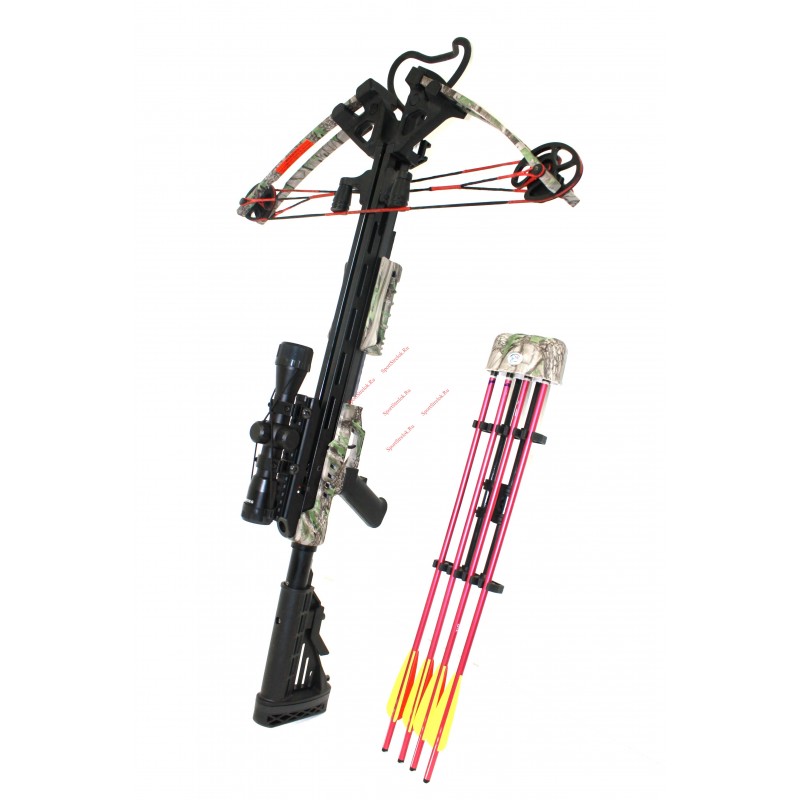 Полная комплектация: Оптический прицел 4*32, плечи в сборе , 4 стрелы аллюминий, ключи для сборки, воск, натяжитель, кивер, ремень