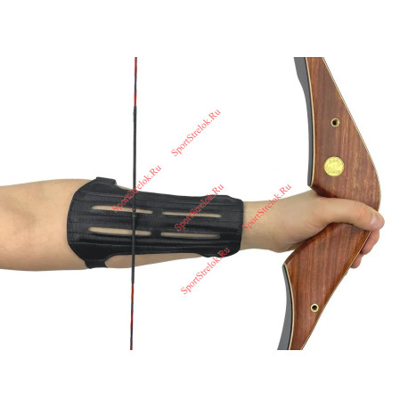 Крага изготовлена из натуральной высококачественной кожи. Внутренняя поверхность краги мягкая, что позволяет комфортно носить крагу на голой руке. Предусмотрены отверстия для вентиляции для ношения в помещениях и на улице в теплое время года. Крага дополнительно армирована гибкими пластиковыми ребрами жесткости, предотвращающими удар тетивой лука во время выстрела. Подходит для любого размера руки.